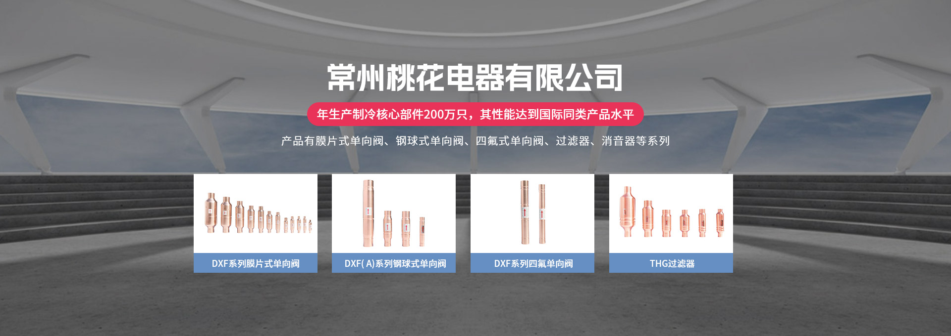 常州桃花電器有限公司地處中國長江“金三角”之稱的上海至南京高速公路、城際高鐵、常州高新經濟技術開發區路段,交通便利、技術力量十分雄厚。它是集研究、開發設計、制造和經營制冷核心部件的企業,主要生產中央空調上使用的制冷部件。產品有膜片式單向閥、鋼球式單向閥、四氟式單向閥、過濾器、消音器等系列。年生產制冷核心部件200萬只,其性能達到國際同類產品水平?! ∑髽I擁有先進的科學技術、國際先進的生產加工設備和精密的檢測儀器,并已通過ISO9001質量體系及CE認證,公司歷史悠久,2000年起,經過長期積累、沉淀,經驗豐富,從而保證了產品的高質量、高性能、高耐用性。企業產品在國內外市場具有較高的知名度,深受眾多中外品牌制冷客商的好評。主要客戶有約克、麥克維爾、美的、開利、特靈、頓漢布什、清華同方、天加等.并出口北美、歐洲、東南亞等地區?! 「咂焚|產品是企業的保證,周到服務是合作友誼的承諾,企業本著“求